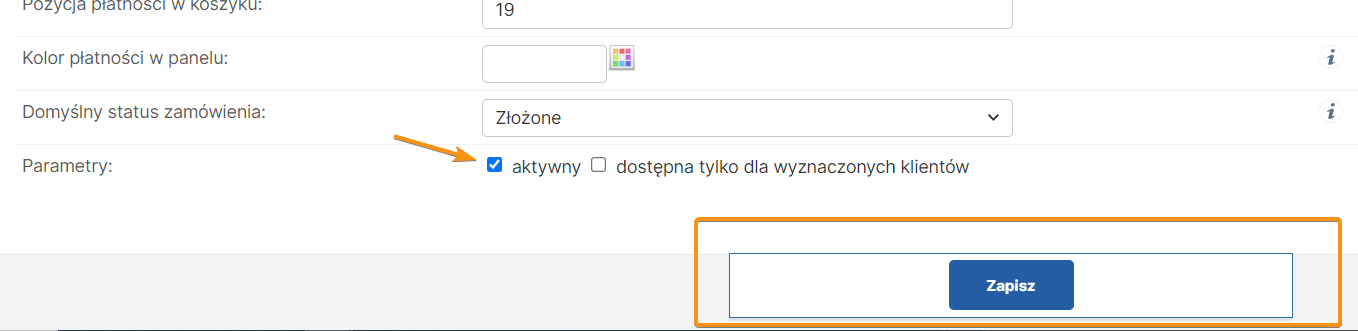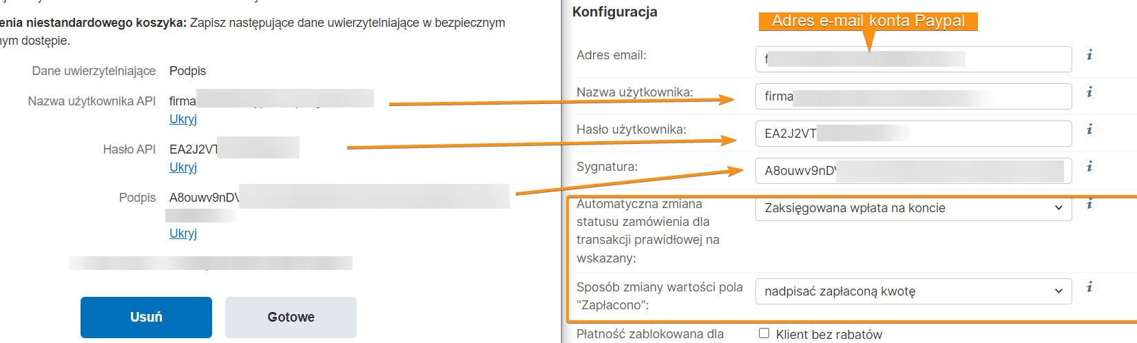 6. Odczytujemy dane klikając linki Pokaż i kopiujemy dane do sklepu, operacji dokonujemy w edycji formy płatności. Zakładka Konfiguracja -> Formy płatności -> Płatność PayPal Express Checkout. Po skopiowaniu danych, definiujemy jeszcze Automatyczną zmianę statusów oraz sposób zmiany wartości pola „Zapłacono”.  Aktywujemy formę płatności klikając checkbox aktywny i zapisujemy.