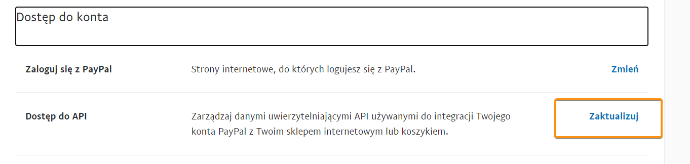 3.  W zakładce Dostęp do API Klikamy Zaktualizuj