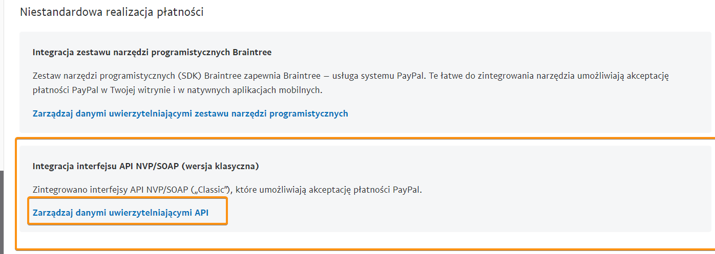 4. Zjedź w dół do opcji : Integracja interfejsu API NVP/SOAP (wersja klasyczna) i kliknij w link Zarządzaj danymi uwierzytelniającymi API