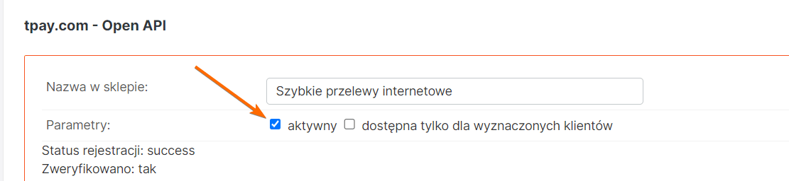 Będzie to oznaczać, że płatności są aktywne i można uruchomić je dla klientów checkboxem aktywny: