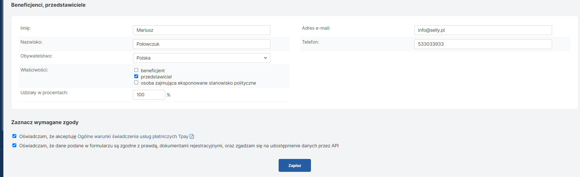 - Zadeklaruj, że dane podane w formularzu są zgodne z prawdą oraz zgadzasz się na ich udostępnienie przez API.