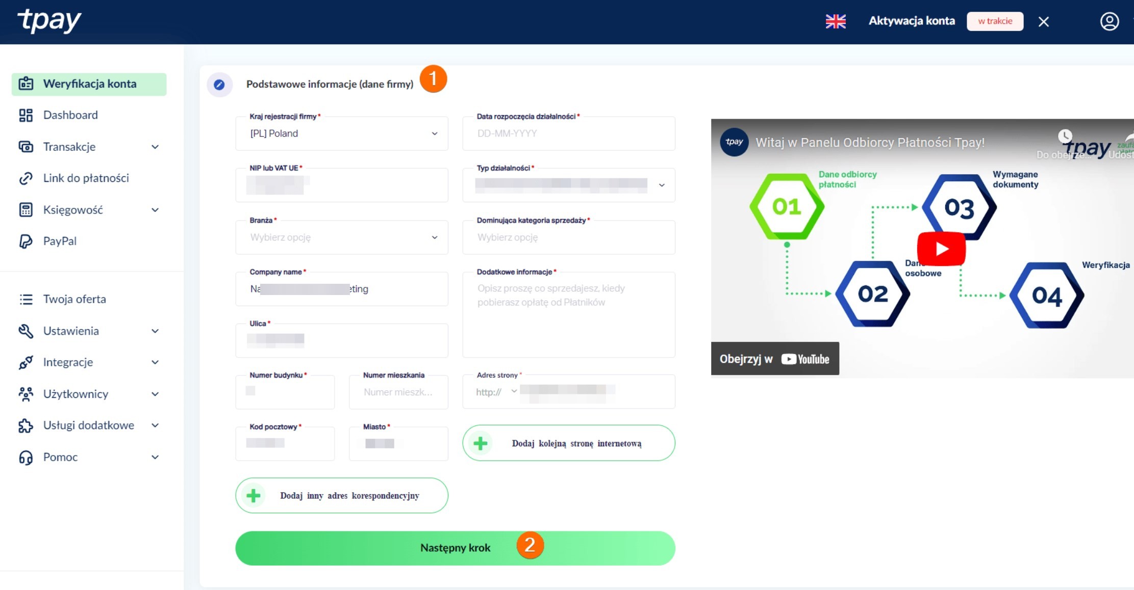 Krok 1: Sprawdź dane firmy i zapisz zmiany (zostaną zaciągnięte automatycznie z wniosku rejestracyjnego):