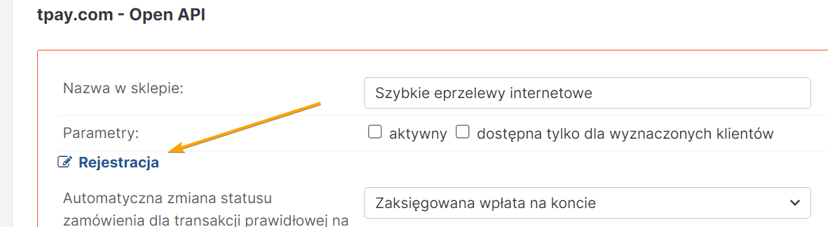 - Zaznacz opcję Rejestracja w celu aktywacji tej metody płatności i umożliwienia korzystania z Tpay Open API.