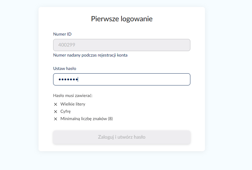 Ustaw bezpieczne hasło i ZAPAMIĘTAJ SWÓJ NUMER ID – kliknij przycisk „Zaloguj i utwórz hasło”