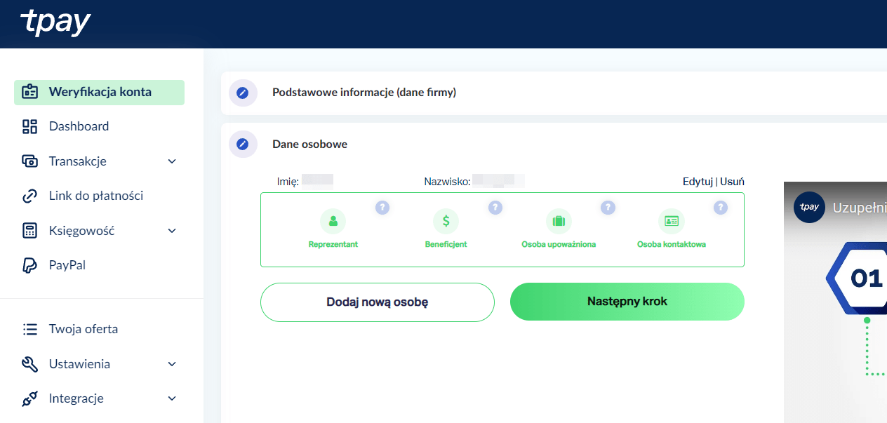 Opcja powinna być użyta tylko w przypadku zmiany danych firmy – usunięcie spowoduje konieczność ponownej weryfikacji (przelewu weryfikacyjnego).