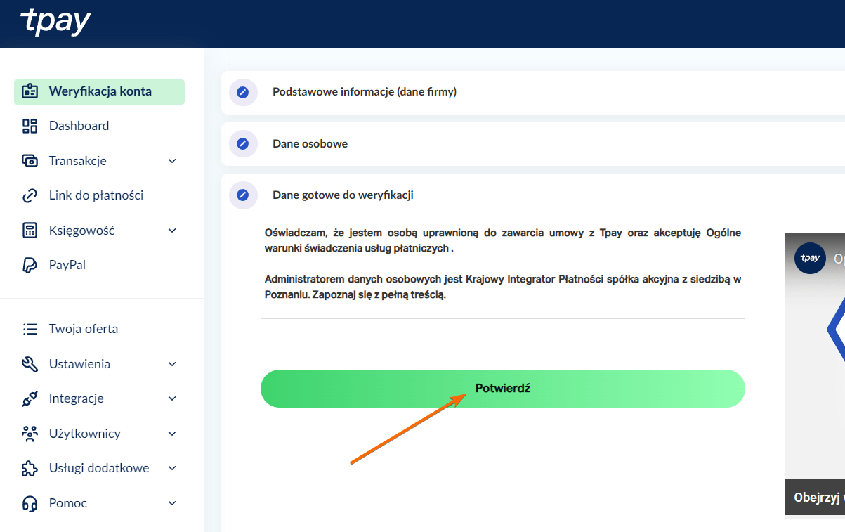 - Potwierdź akceptację ogólnych warunków świadczenia usług Tpay.