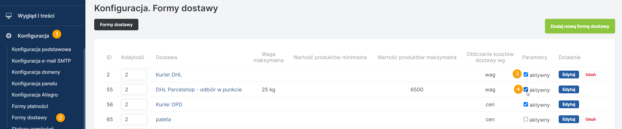 - W celu włączenia formy dostawy Kurier DHL oraz DHL Parcelshop, kierujemy się w menu do Konfiguracja -> Formy dostawy. Zaznaczamy parametr aktywny i zapisujemy zmiany. Dokładną konfigurację form dostaw wraz z definicjami kosztów opisujemy tutaj: LINK