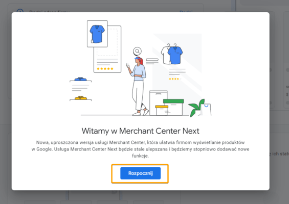• Kliknij na niebieski przycisk „Dalej” lub „Utwórz konto Merchant Center”, aby kontynuować.