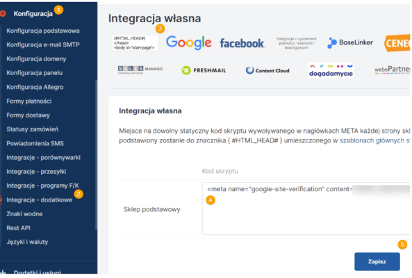 • Postępuj zgodnie z instrukcjami w celu weryfikacji własności Twojej strony internetowej. Wymaga to dodania specjalnego tagu meta. Meta tag należy wkleić do sekcji HEAD w sklepie – Instrukcja