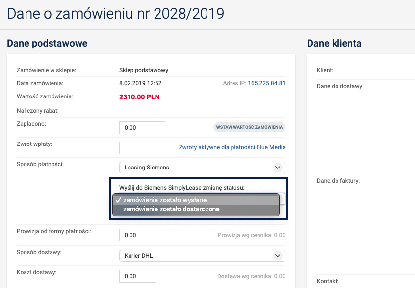 Po złożeniu zamówienia, system automatycznie wysyła wszystkie potrzebne dane do systemu leasingowego, a zadaniem obsługi sklepu jest w późniejszym etapie poinformować leasing o zmianie statusu zamówienia przez poniższe opcje: