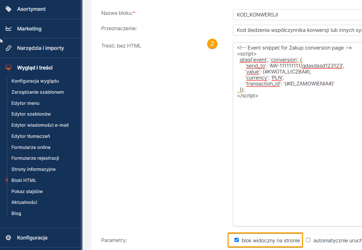 - Drugi fragment, śledzący konwersje wklejamy do bloku HTML KOD_KONWERSJI. Wygląd i treści -> Bloki HTML