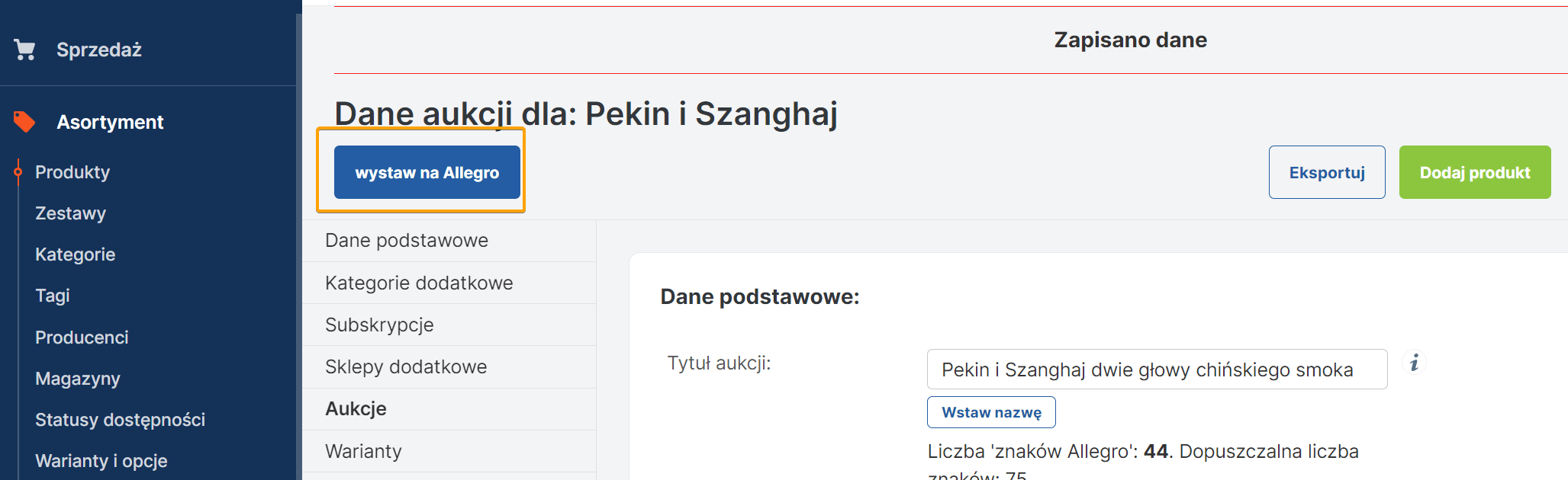 - w edycji produktu z zakładki „AUKCJE” klikając w button „Wystaw na Allegro”