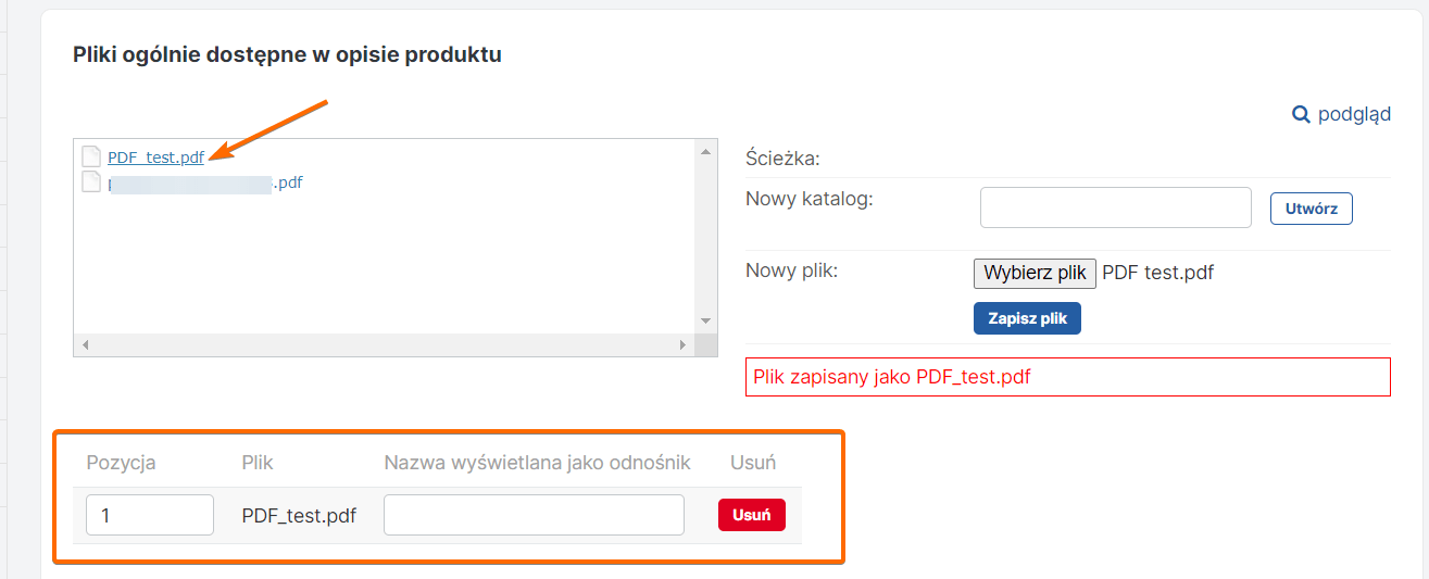 Po kliknięciu w plik pojawi się nowa pozycja – w miejscu ’Nazwa wyświetlana jako odnośnik’ wpisz nazwę pod którą plik będzie wyświetlany na karcie produktu:
