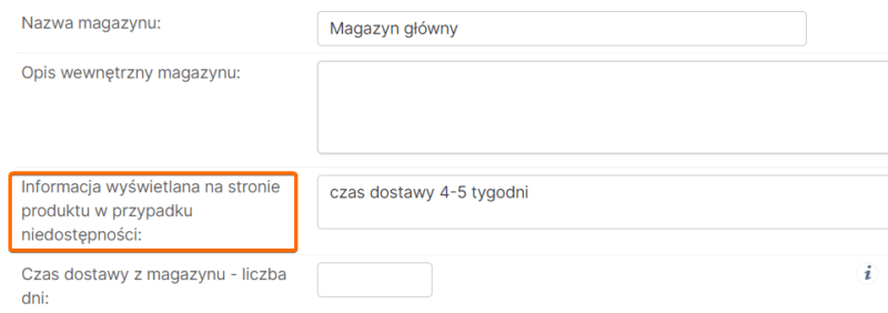 - W zakładce asortyment>magazyny wybieramy konkretny magazyn, w polu edycji Informacja na stronie wyświetlana na stronie produktu w przypadku braku dostępności wpisujemy komunikat, np. czas dostawy 4-5 tygodni: