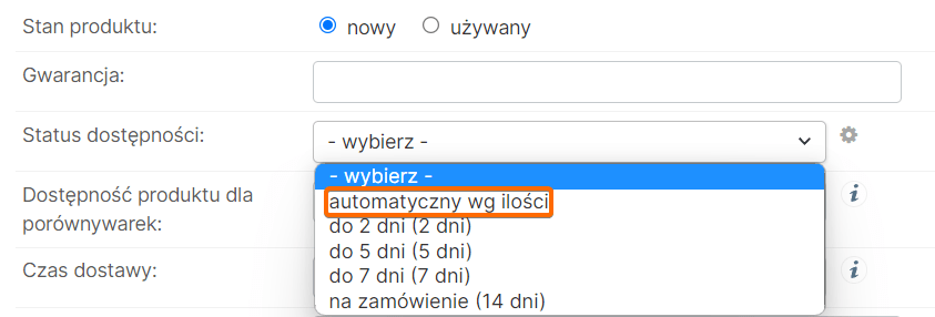 Statusy dostępności, które mają określoną minimalną ilość produktów są statusami automatycznymi, system weryfikuje czy produkt w magazynie domyślnym ma odpowiednią ilość sztuk (opcja ta nie obsługuje wariantów) - Status dostępności ustawiamy w edycji danego produktu wybieramy z rozwijanej listy automatyczny wg ilości: