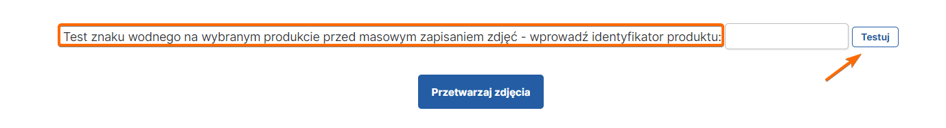 w polu Test znaku wodnego na wybranym produkcie przed masowym zapisaniem zdjęć – wprowadź identyfikator produktu wpisujemy id produktu dla którego chcemy przetestować widoczność znaku wodnego