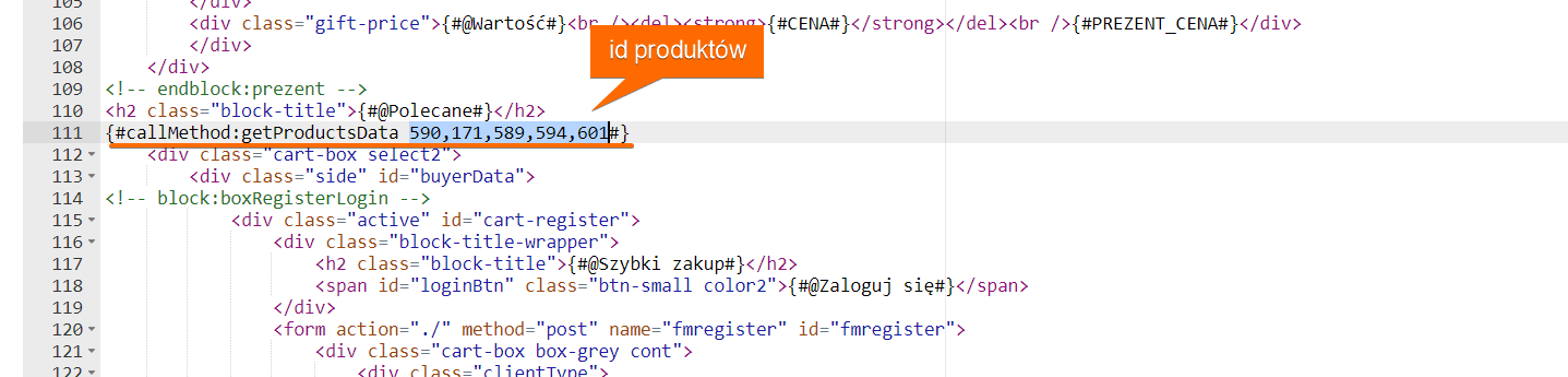 Id produktów, które mają się wyświetlać dodajemy po przecinku: