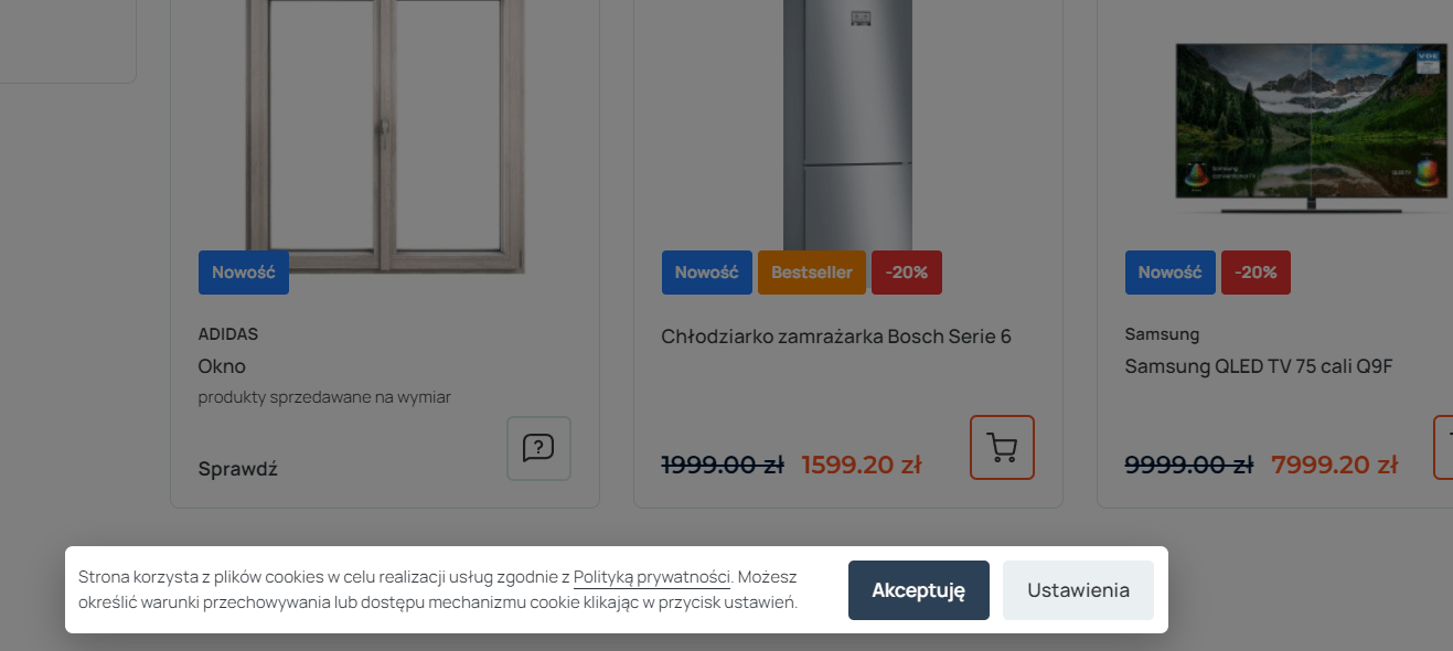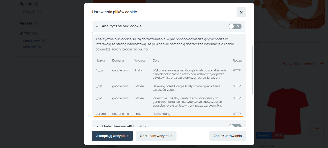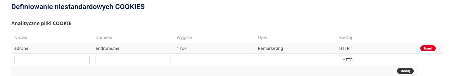 ?Moduł pozwala również na dodanie własnych, niestandardowych plików cookies. Każdy z właścicieli sklepów samodzielnie dodaje takie cookies na podstawie informacje od dostawcy integracji jak np. Edrone. Dodanie informacji do tych pól zwyczajnie je wyświetli 1:1 w cookie bar jak w przykładzie poniżej.