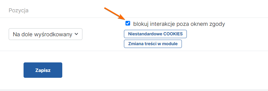 ? Zaznaczając checkbox blokuj interakcje poza oknem zgody, zablokujemy użytkownikowi możliwość reakcji w sklepie bez wcześniejszego zaznaczenia zgód: