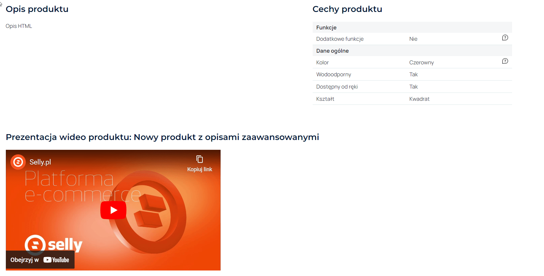 - Wklej kod HTML w pole Filmy w edycji produktu.