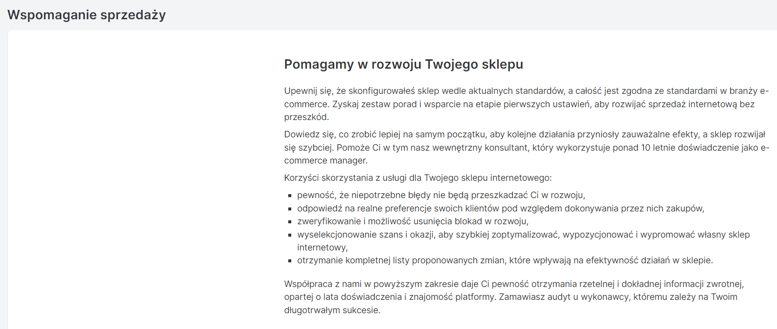 ? Wspomaganie sprzedaży – nasz specjalista przeprowadzi audyt i zaproponuje zmiany w Twoim sklepie, aby działał zgodnie z obowiązującymi trendami pomoże na etapie pierwszych ustawień, abyś mógł rozwijać sprzedaż internetową bez przeszkód.