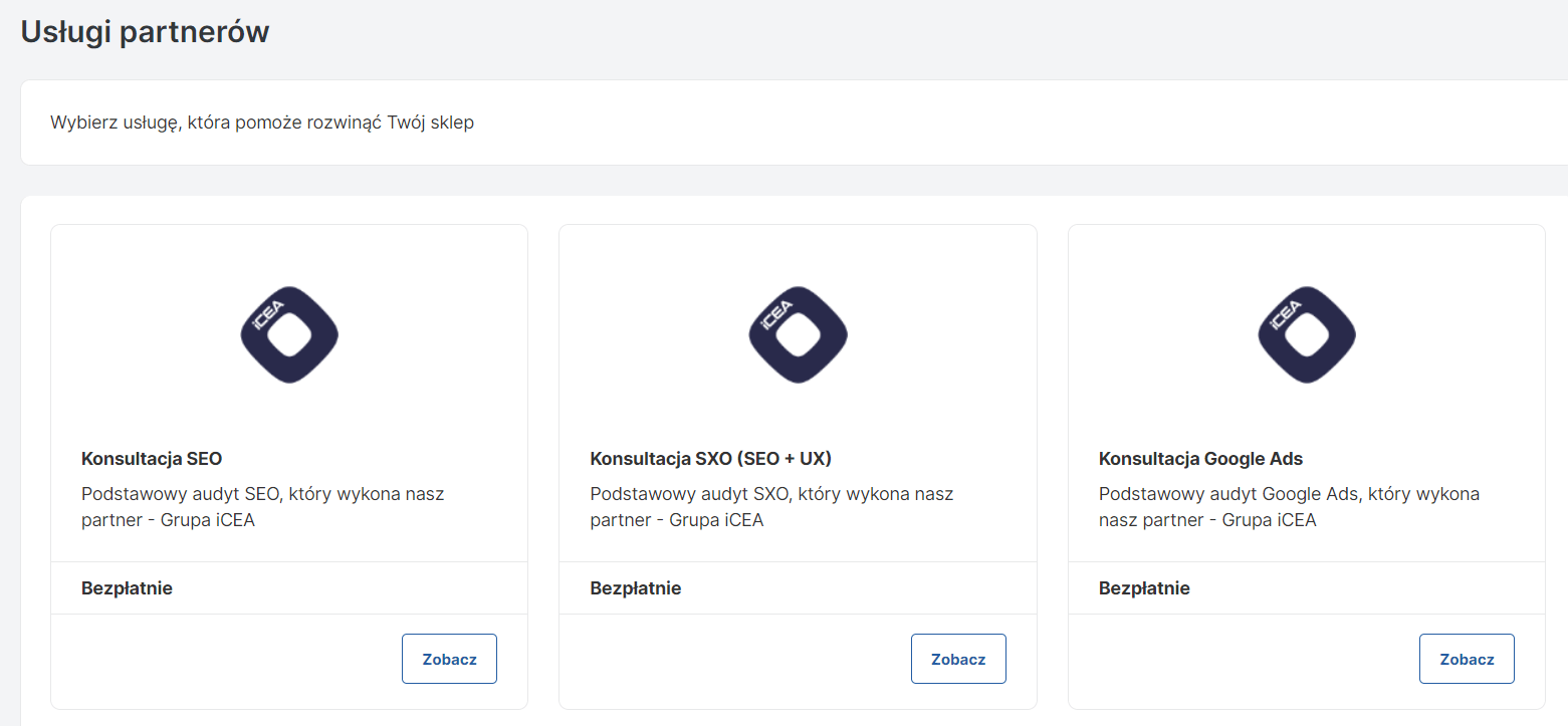W panelu administracyjnym sklepu w zakładce Dodatki i usługi znajduje się spis dostępnych i najczęściej zamawianych funkcjonalności: