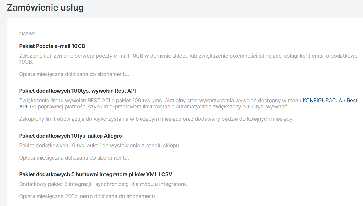 ?Usługi dodatkowe – z tego miejsca możesz zamówić takie usługi jak dodatkowy pakiet poczty czy instalację dodatkowego sklepu: