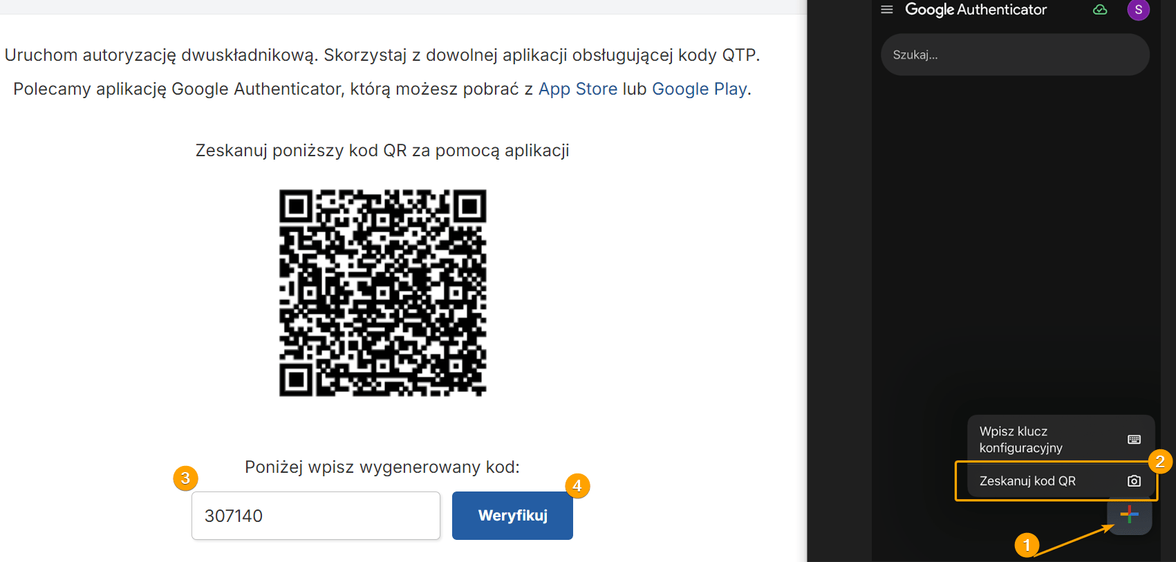 - Weryfikacja 2FA – Aplikacja Google Authenticator (zrzut ekranu – prawa strona):