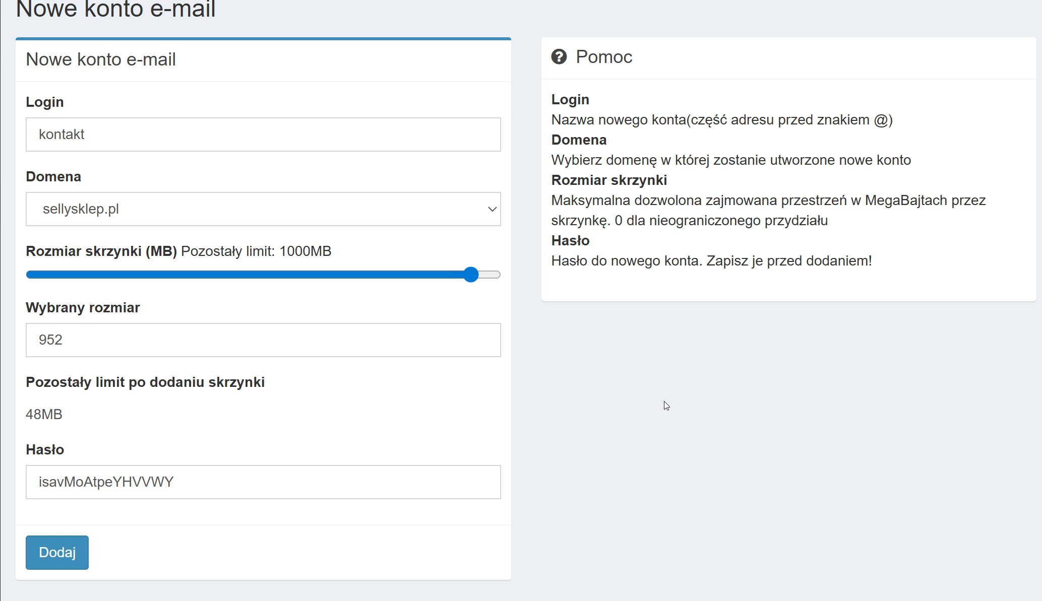 Dodając nową skrzynkę email należy wpisać login konta oraz zapamiętać wygenerowane losowo hasło lub wpisać własne.