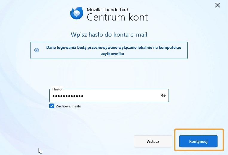 Wpisz hasło do skrzynki i kliknij Kontynuuj, aby zakończyć konfigurację.