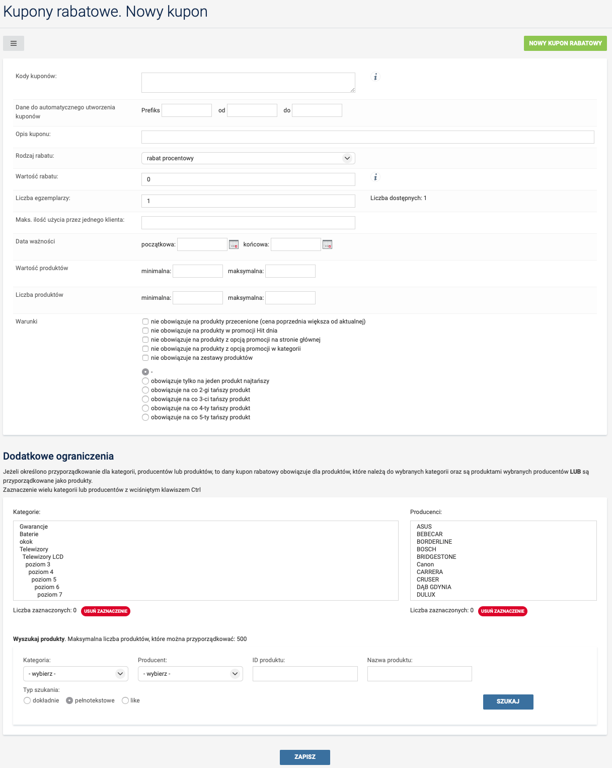 • ustawienia reguł automatycznego generowania kuponu rabatowego