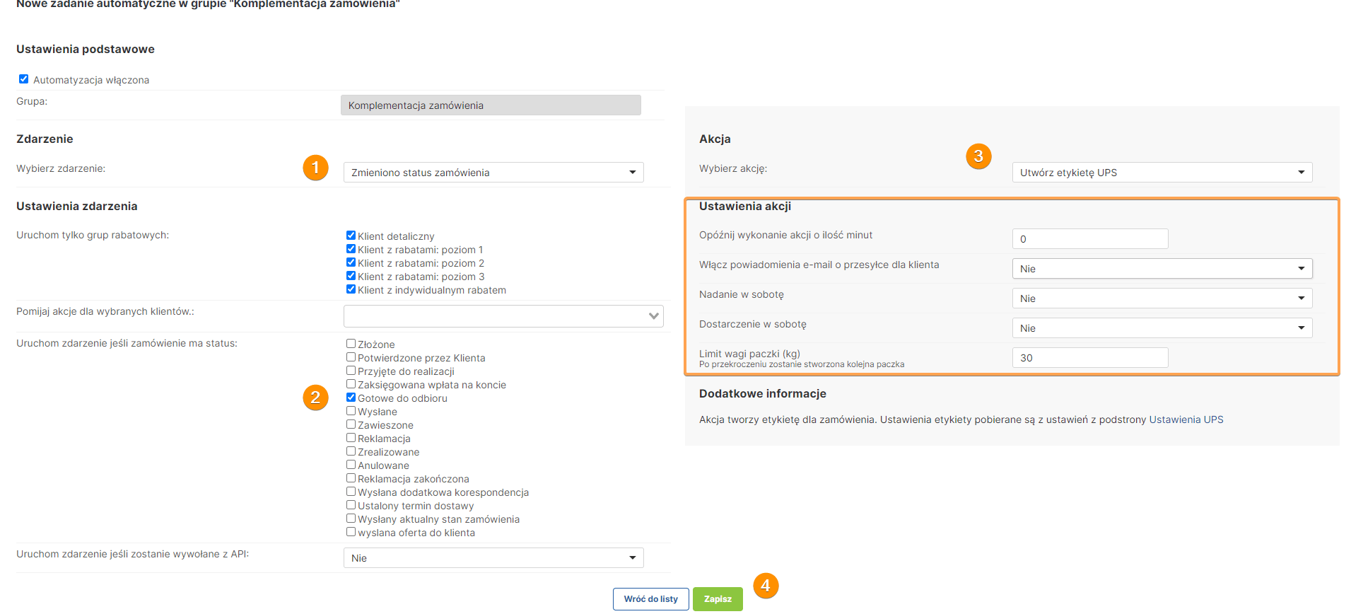 Wybieramy zdarzenie Zmieniono status zamówienia oraz zaznaczamy checkboxem, dla jakiego statusu zdarzenie ma się uruchomić – Gotowe do odbioru. Następnie wybieramy akcje Utwórz etykietę UPS oraz definiujemy dodatkowe ustawienia akcji w zależności od własnych preferencji. Zapisujemy, wracamy do automatyzacji zadań i ponownie dodajemy nowe zadanie w zdarzeniu.