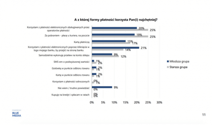 Dostrzega się również zależności w preferowanych metodach płatności zależnie od grupy wiekowej konsumentów. Młodsza grupa bowiem, jak się okazało, znacznie częściej niż starsza grupa preferuje przejść w celu uregulowania zapłaty na stronę banku. Najpopularniejsze u obu grup okazały się szybkie płatności internetowe, płatność kartą i za pobraniem.
