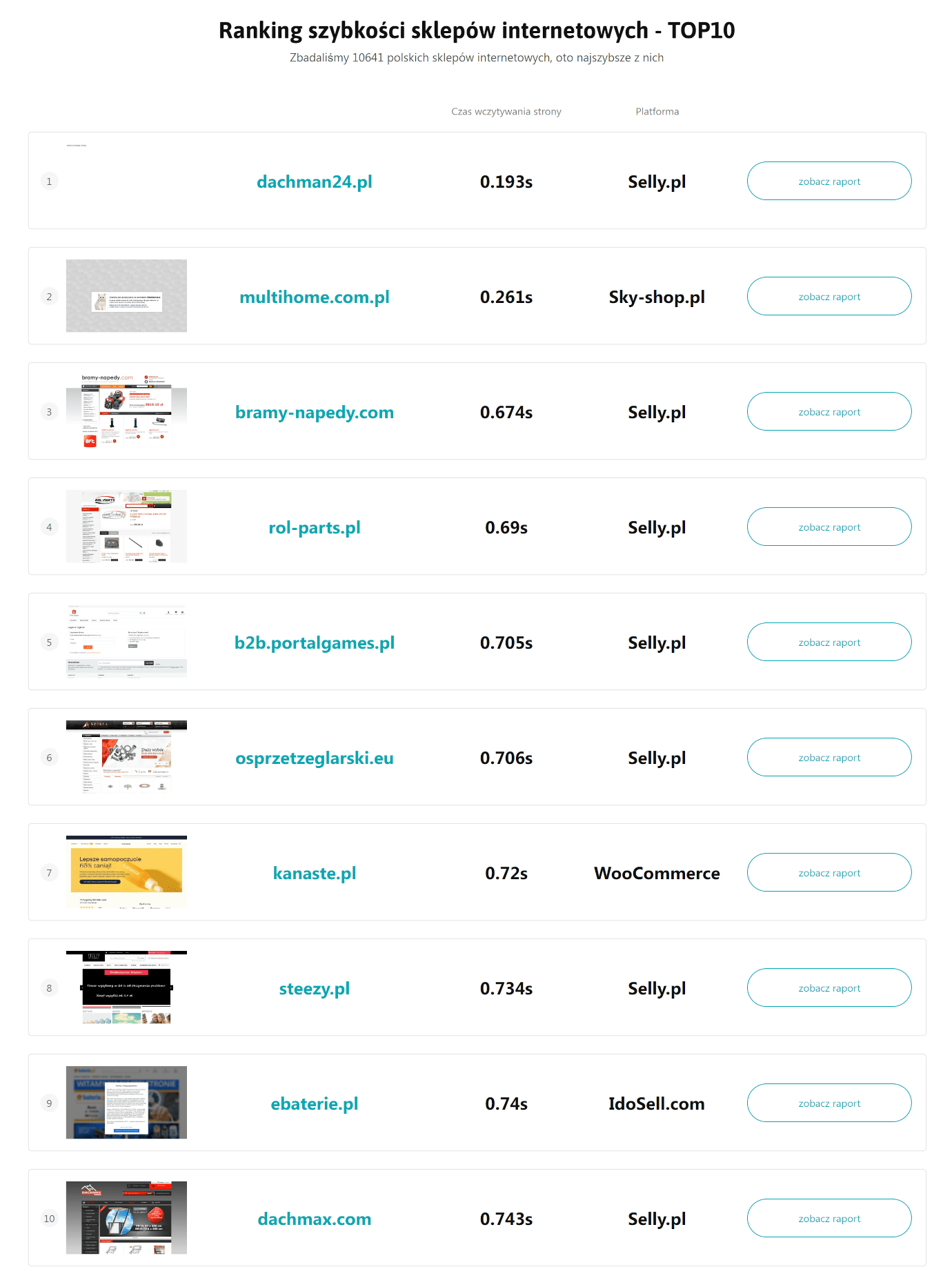 Platforma szybkiesklepy.pl stworzyła ranking najszybciej działających sklepów internetowych. W TOP 10 znalazły się sklepy założone na takich platformach, jak Selly.pl, Sote.pl, oraz IdoSell.com. Platforma Selly może się pochwalić wieloma sklepami, które w tym rankingu osiągnęły dobre wyniki. Strona na Selly.pl osiągnęła drugie miejsce, z czasem ładowania w wysokości 0,674 sekundy.